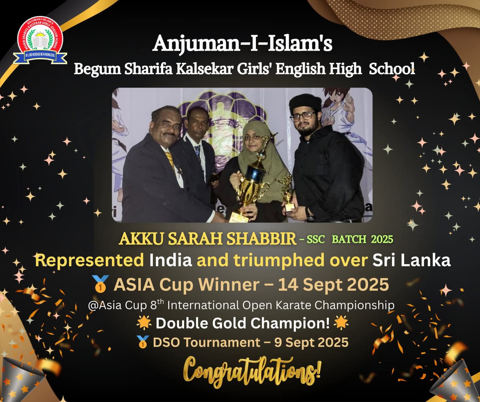Our alumna Akku Sarah Shabbir (SSC Batch 2025) represented India and triumphed over Sri Lanka, winning the Asia Cup (14 Sept 2025) at the Asia Cup 8th International Open Karate Championship.The event featured strong participation from Nepal, Bangladesh, and Japan as well. She is also a Double Gold Champion and DSO Tournament Winner (9 Sept 2025).